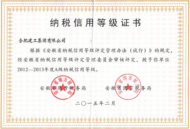 安徽省A級納稅信用等級證書