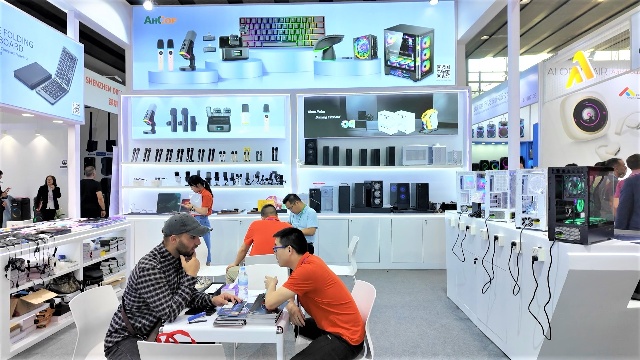 在電子消費(fèi)品類展區(qū),安糧推出了不同款式的散熱機(jī)箱,再加上融入人體工程學(xué)設(shè)計(jì)的配套鍵鼠,能滿足不同PC DIY的需求。此外,大容量、多接口、充電快的移動電源,也引得不少意向客戶紛紛下訂。